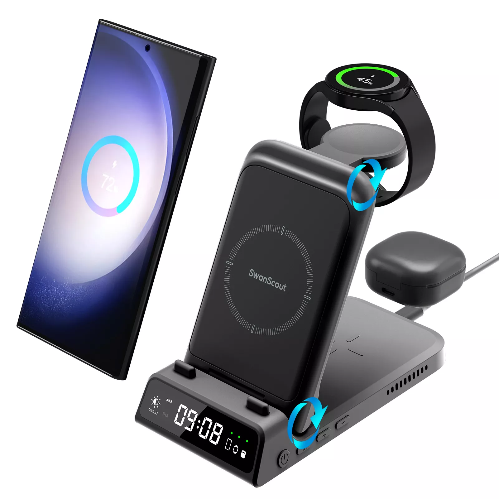 The Wireless Charging Station is the ultimate solution for charging your Samsung devices all in one place. Designed with compatibility in mind, it supports a wide range of Samsung Galaxy smartphones, smartwatches, and earbuds. Whether you’re at home, in the office, or traveling, this sleek and foldable charging station is perfect for keeping your devices powered up without the hassle of multiple cables.